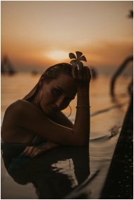 A serene portrait of a woman with a flower, enjoying a sunset in Bali's infinity pool.