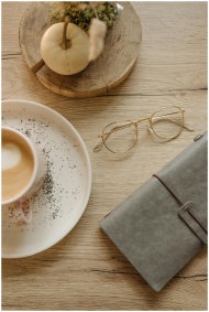 A cozy coffee setup featuring a cappuccino, notebook, glasses, and decorative items on a wooden table.