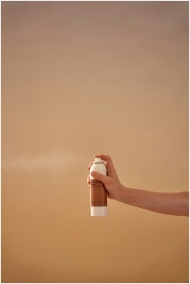 A clean studio shot of a hand holding a sunscreen spray bottle with a neutral background.