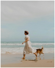 Carefree woman running with her dog along a sunny beach in Phuket, Thailand, embracing summer joy.