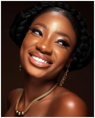 Portrait of a smiling woman with braided hair, earrings, and necklace in a studio setting.