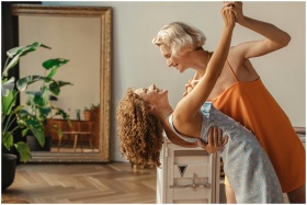 Happy couple sharing a joyful dance in a cozy indo