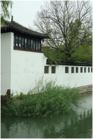 Serene view of traditional Chinese building by a calm canal, lush greenery