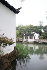 Peaceful view of traditional Chinese architecture by a calm canal.