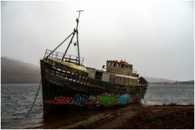 Eerie abandoned ship with vibrant graffiti on the shore, surrounded by misty lake view.