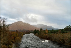 Serene landscape of a river flowing through autumn foliage with mountains in the background.