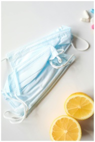 A composition of face masks, lemon halves, and pills, symbolizing health, protection, and vitamin C.