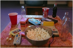 A nostalgic setup with popcorn, VHS tapes, and ret