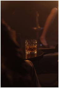 A sophisticated whiskey glass with ice in a dimly lit club setting, perfect for nightlife ambiance.