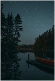Starry night sky over a tranquil Oregon lake with forest reflection, capturing serene long exposure astrophotography.