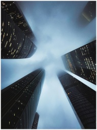 Fog envelops the tall skyscrapers in Moscow's fina