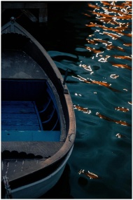 A tranquil night scene of a rowboat docked by shimmering water reflections.