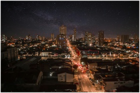 Captivating night cityscape of Nazaré, Brazil, showcasing vibrant urban lights and a starry sky.