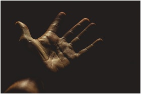 A powerful silhouette of an outstretched palm against a dark background, evoking emotion.