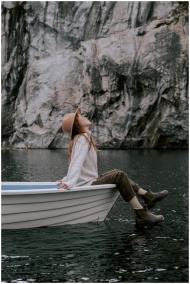 A woman enjoying a peaceful moment on a wooden boat at a picturesque lake with rock formations.