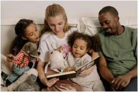 A diverse family enjoys reading a storybook together, fostering warmth and connection.