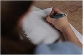 A student writes mathematical notes in a notebook