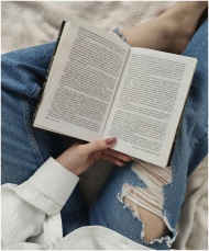A woman enjoys a relaxing day reading a book while lounging indoors, dressed in casual jeans.