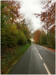 A peaceful rural road in Northern France surrounded by colorful autumn foliage.