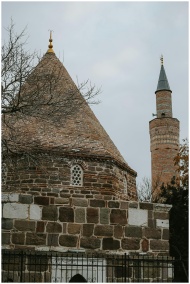 A historic brick building with a conical roof and a minaret under an overcast sky, showcasing architectural beauty.