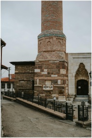 A historic mosque tower on a quiet village street showcases rich architectural details.