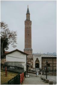 View of a historic mosque with a minaret in an urb