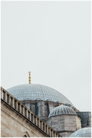 Elegant architectural details of a mosque dome under a clear sky in Istanbul.