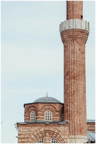 Close-up of a red brick minaret and dome showcasin