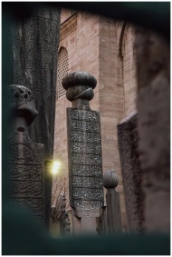 A serene view of ancient tombstones with intricate
