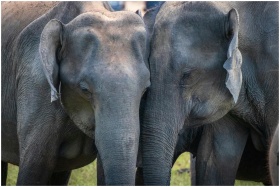 A touching close-up of two elephants affectionatel