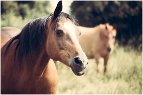 Close-up of horses standing in a sunlit pasture, surrounded by lush greenery.