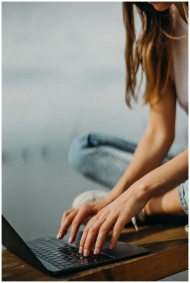A young woman working remotely on her laptop by a calm waterfront.