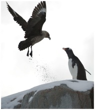 Gentoo penguin and brown skua in a snowy terrain, showcasing wildlife interaction in winter.