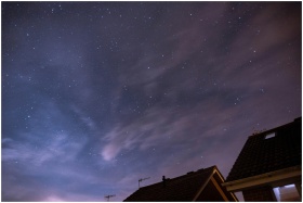 Long-exposure capture of a star-filled night sky with clouds and rooftops in view.