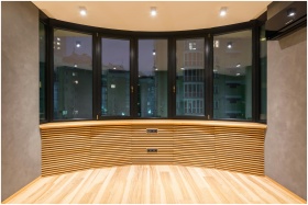 Stylish modern apartment space featuring large windows and wooden flooring.