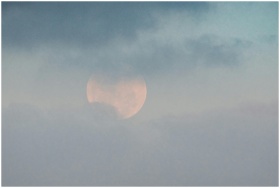 White moon showing through thick clouds on blue sk
