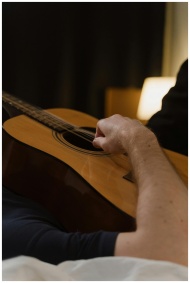 A man lying in bed playing an acoustic guitar in a