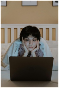 A woman comfortably browsing on her laptop while lying in bed, under a warm blanket.