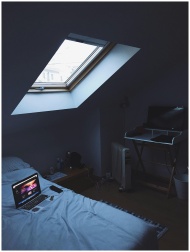 A modern home office setup in a cozy attic bedroom with skylight.