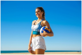 Young woman in sportswear smiling while holding a volleyball on a sunny beach.