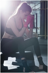 Woman in activewear sitting in gym with thoughtful