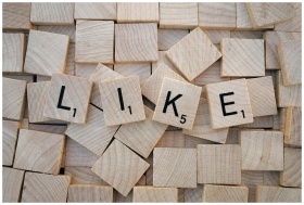 Top-down view of Scrabble tiles spelling 'LIKE' on