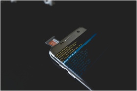 Close-up of a smartphone displaying Android recovery mode with an SD card inserted.