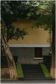 A quaint urban building facade with surrounding trees and steps leading to the entrance.
