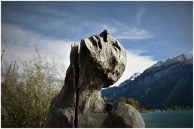 A close-up view of a rustic carved wood sculpture set against a scenic mountain lake backdrop.
