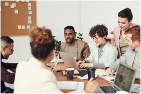 Multicultural team engaged in a collaborative office meeting, discussing ideas around a table with laptops.