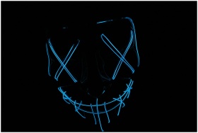 Futuristic neon blue LED mask glowing in the dark, ideal for tech and cyber themes.