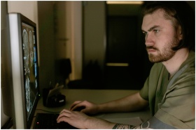 Radiologist intensely studies CT scan results on c