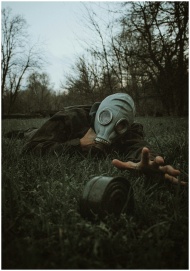 A person wearing a gas mask reaches across the grass in a moody forest setting.