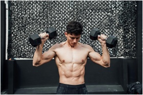 A shirtless muscular man lifts dumbbells at a gym